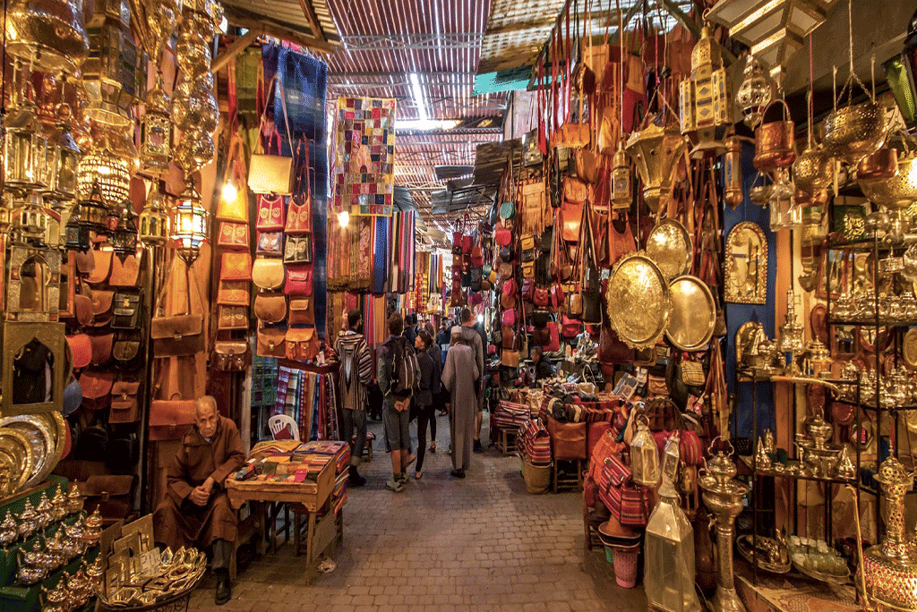 马拉喀什的露天市场是摩洛哥最大、最美丽的露天市场之一,出售各种商品,包括手工艺品、皮革制品、陶器、珠宝、香料、拖鞋、服装等等。